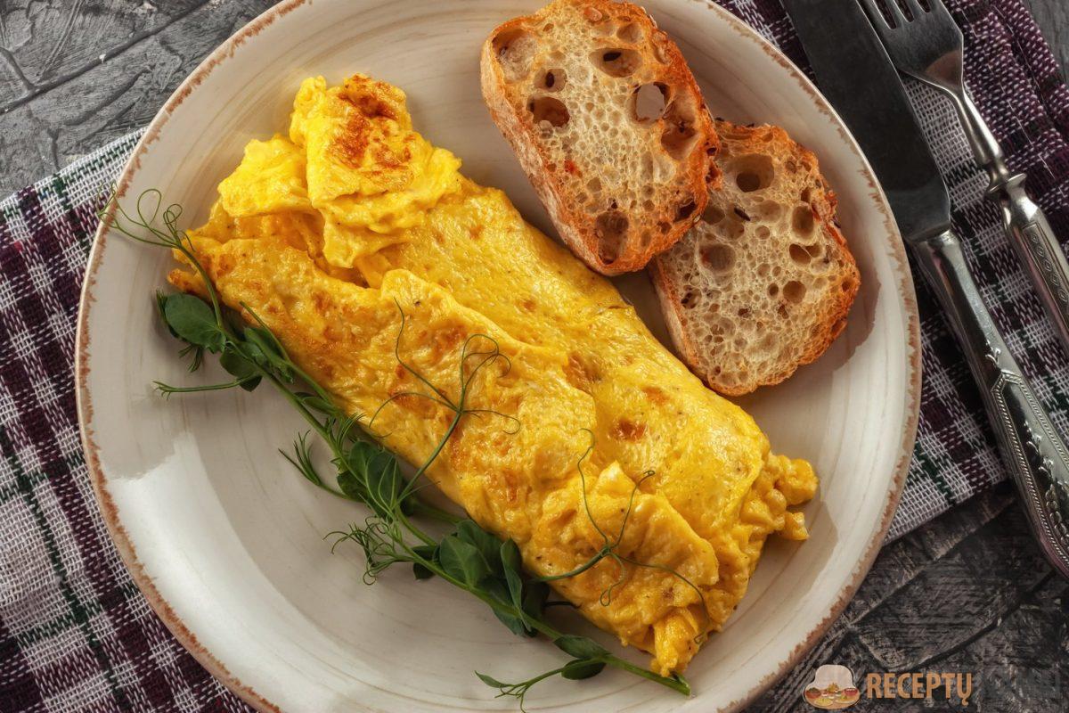 7. Kai omletas iškeps iš vienos pusės, jį apverskite ir ant pusės užtepkite paruošto įdaro. Uždenkite įdaru kita omleto puse ir uždenkite keptuvę dangčiu.