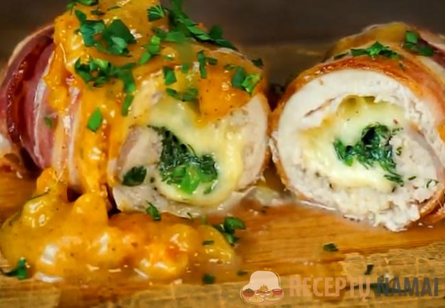 Gautu įdaru aptepkite vištienos filė ir suvyniokite ją į ritinėlį.