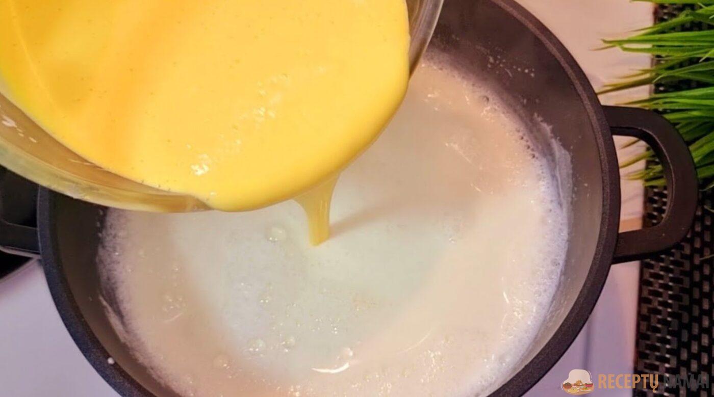 . Kiaušinių ir grietinės mišinį supilkite į verdantį pieną ir maišydami virkite iki tirštos masės apie 4-5 min.