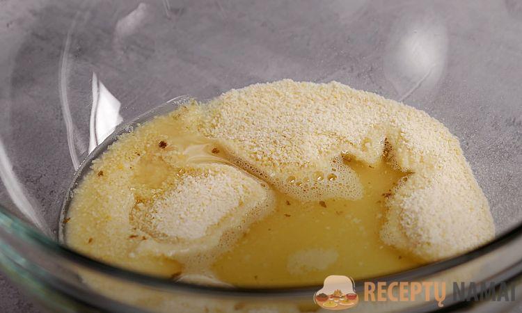 2. Atskirame dubenyje sumaišykite džiūvėsėlius su vištienos sultiniu ir palikite 5 minutėms išbrinkti.