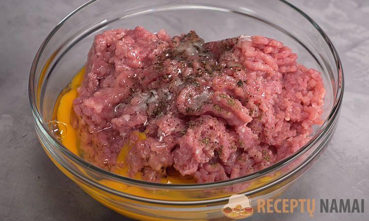 3. Kalakutienos šlaunelių filė pertrinkite per mėsmalę. Maltą mėsą sumaišykite su išbrinkusiais džiūvėsėliais, kepintais svogūnais, kiaušiniais, druska ir likusiu puse šaukštelio juodųjų pipirų. Palikite 10 minučių pailsėti.