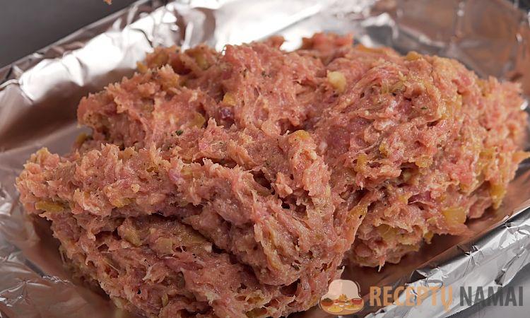 4. Kepimo skardą vienu sluoksniu išklokite folija ir ant viršaus sudėkite mėsos mišinį, suformuodami kepinį.