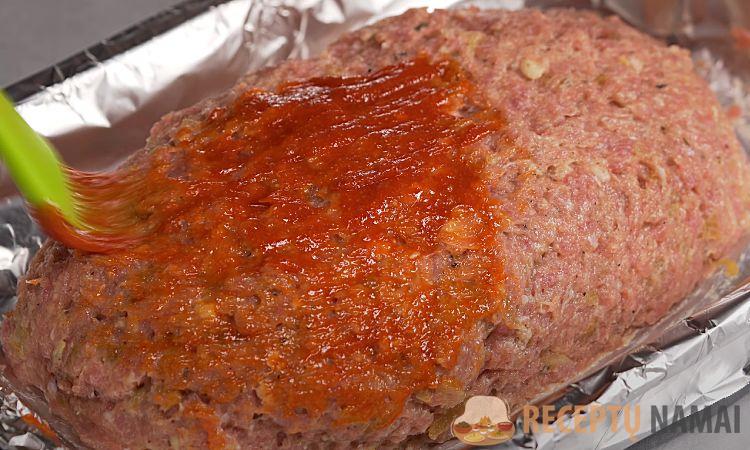 5. Sumaišykite kečupą, saldžiąją papriką, cukrų ir česnako miltelius. Juo gausiai aptepkite būsimą mėsos duoną ir 40 min. pašaukite į iki 180 °C įkaitintą orkaitę. Po to paviršių dar kartą aptepkite likusiu kečupu ir pašaukite į orkaitę dar 5 minutėms.