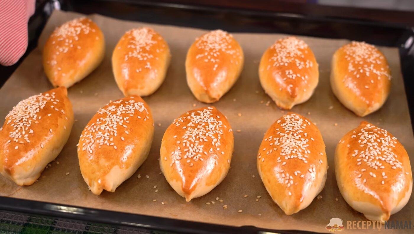 . Suktinukus susukite į plokščius pyragėlius ir sudėkite į juos įdarą. Įdarą užkimškite pyragaičių viduje, sudėkite juos siūle į apačią ant kepimo skardos, išdėliokite atstumais vienas nuo kito.
