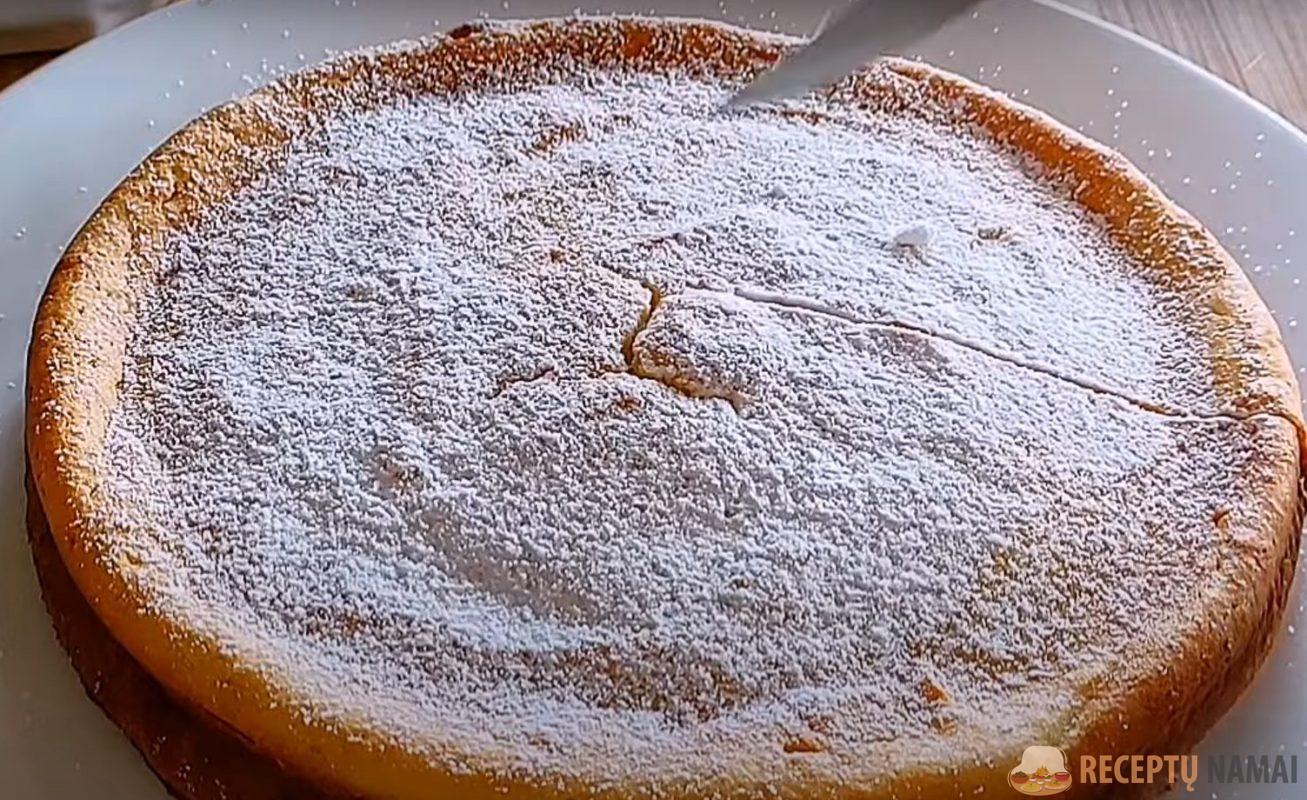 Iškepusį pyragą pabarstykite cukraus pudra. Gausite švelnų citrinų skonio ir kreminės tekstūros varškės apkepą.