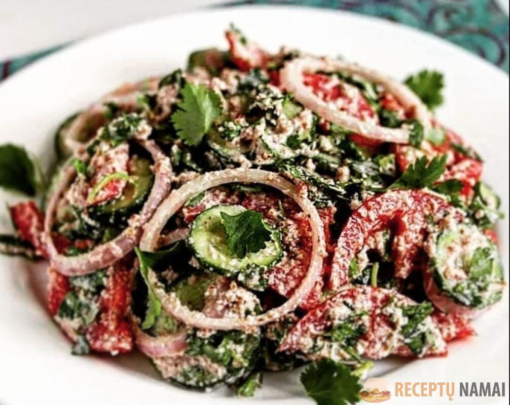 Ant salotų užbarstykite stambiai pjaustytų migdolų ir riešutų.