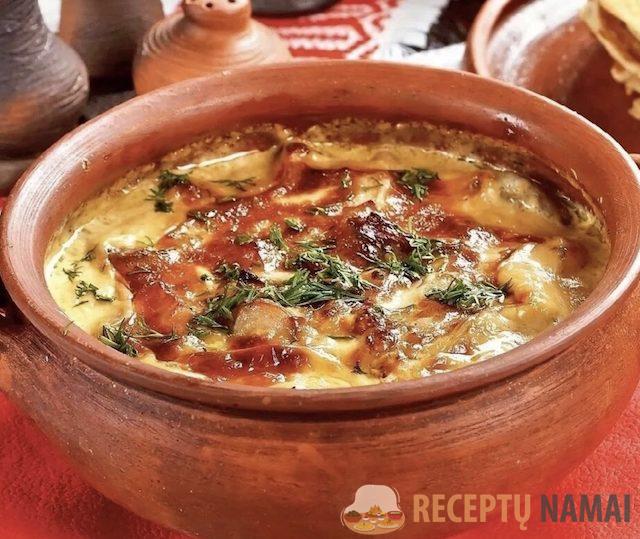 Pripildykite puodus paruoštu grietinės padažu iki pat kaklo.