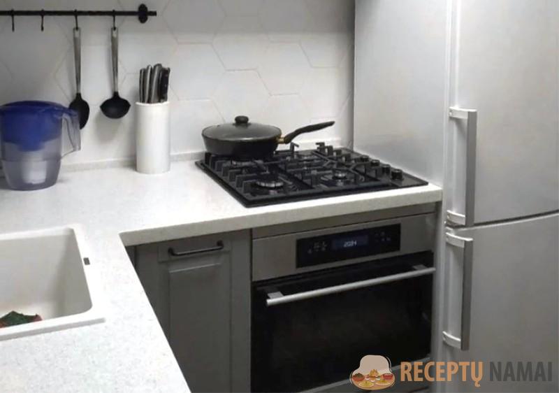 Kitą virtuvės dalį šeimininkai padarė uždarą. Dėl šios įvairovės virtuvė atrodo įdomiau ir tvarkingiau