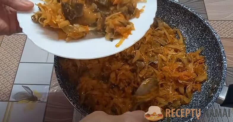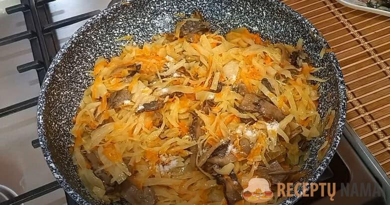 Grybus reikia užpilti vandeniu, kad jie būtų prisotinti drėgmės. Pakanka, kad jie pastovėtų 5-10 minučių. Kopūstus susmulkinti, pasūdyti ir sutrinti rankomis
