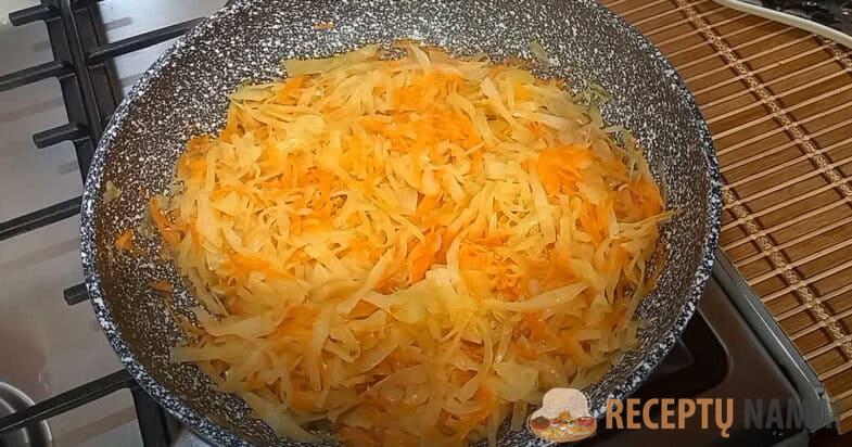 Į keptuvę supilkite augalinį aliejų ir gerai įkaitinkite. Susmulkinkite svogūną ir kepkite, kol paruduos. Sutarkuokite morkas, sudėkite jas į svogūnus ir kelias minutes pakepinkite. Susmulkinkite kopūstus ir taip pat suberkite į keptuvę. Uždenkite dangčiu ir troškinkite ant mažos ugnies, kol suminkštės.