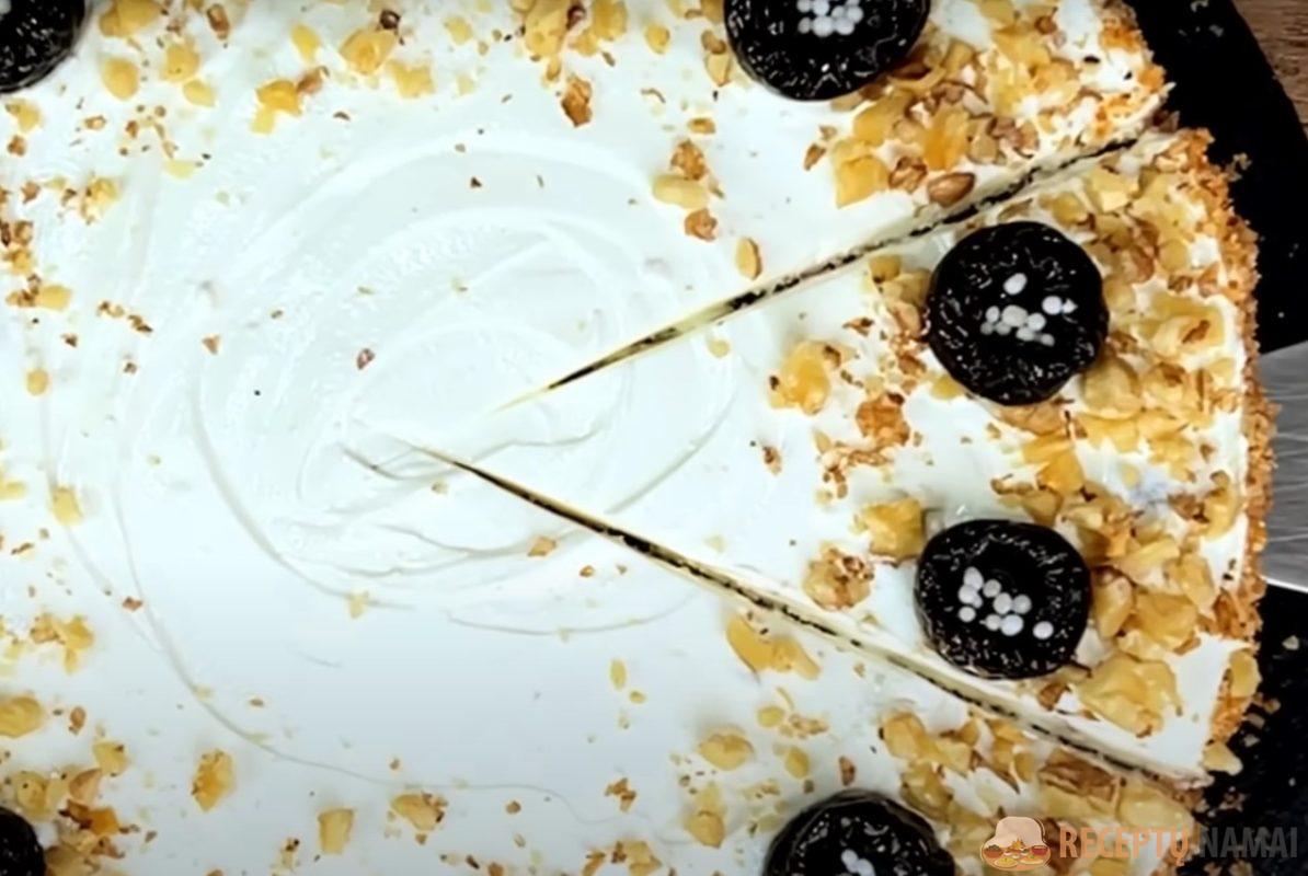 Torto šonus aptepkite kremu, apibarstykite sausainių trupiniais, papuoškite džiovintomis slyvomis ir riešutais. Gausite gražų ir išskirtinį lenkišką tortą.