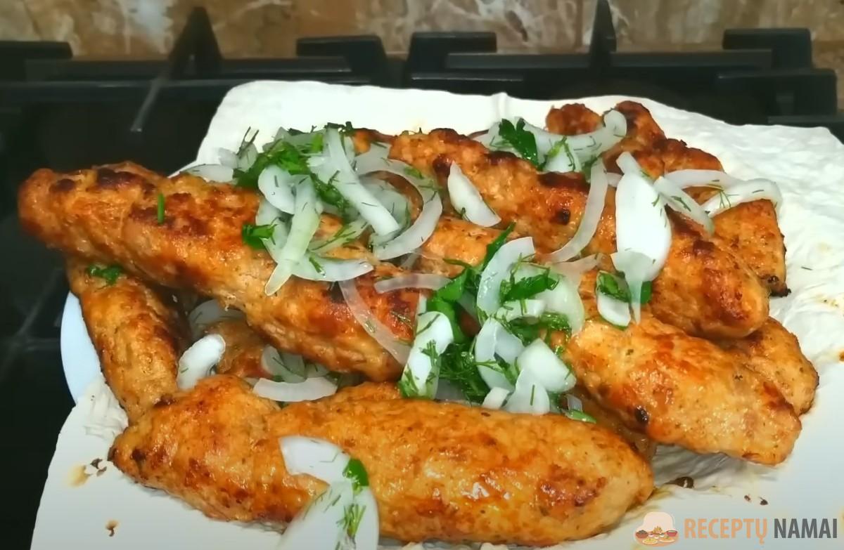 - Kai kebabai bus paruošti, patiekite juos su marinuotais svogūnais ir šviežia pitos duona.