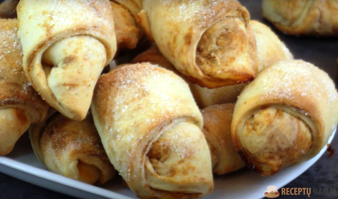 iškočiokite 3-4 mm storio apskritimais. Kiekvieną lakštą padalykite į 8 trikampius sektorius. Ant platesnės kiekvieno sektoriaus dalies dėkite įdaro.