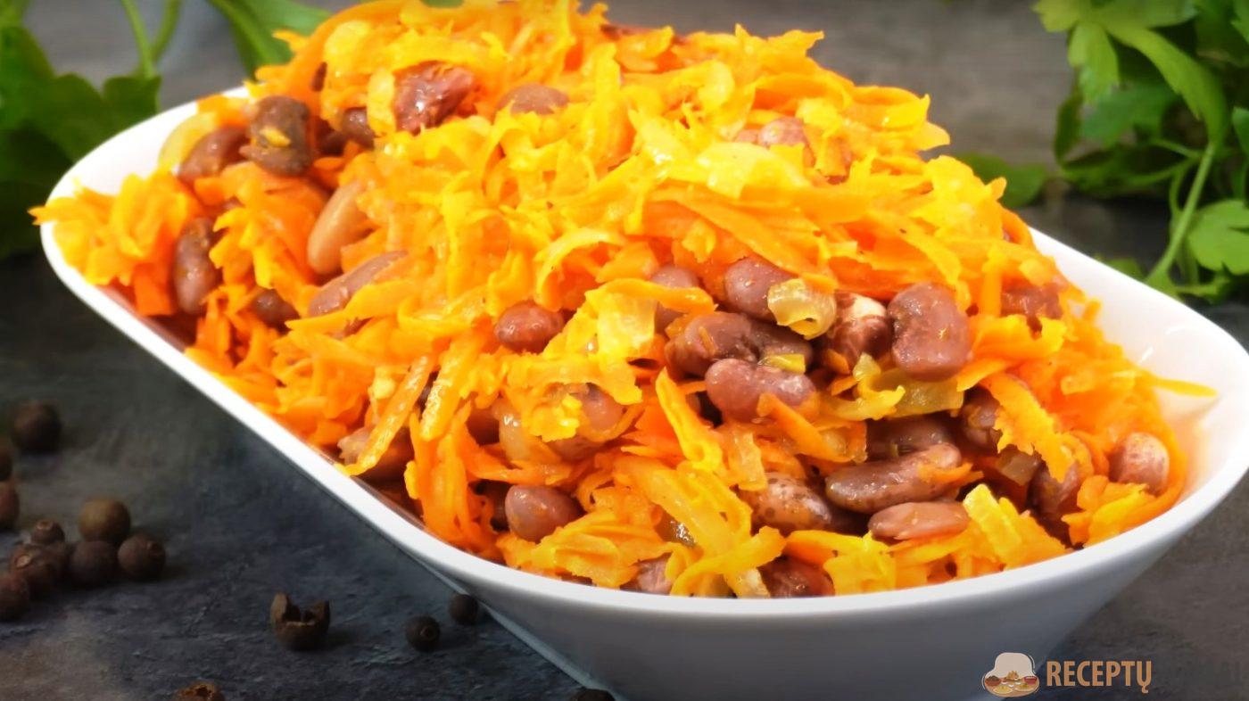 . Keptuvėje augaliniame aliejuje atskirai apkepkite svogūnus ir morkas. Keptuvėje surinkti salotas – prie pupelių sudėti svogūnus, morkas, česnako skilteles pertrinti per presą