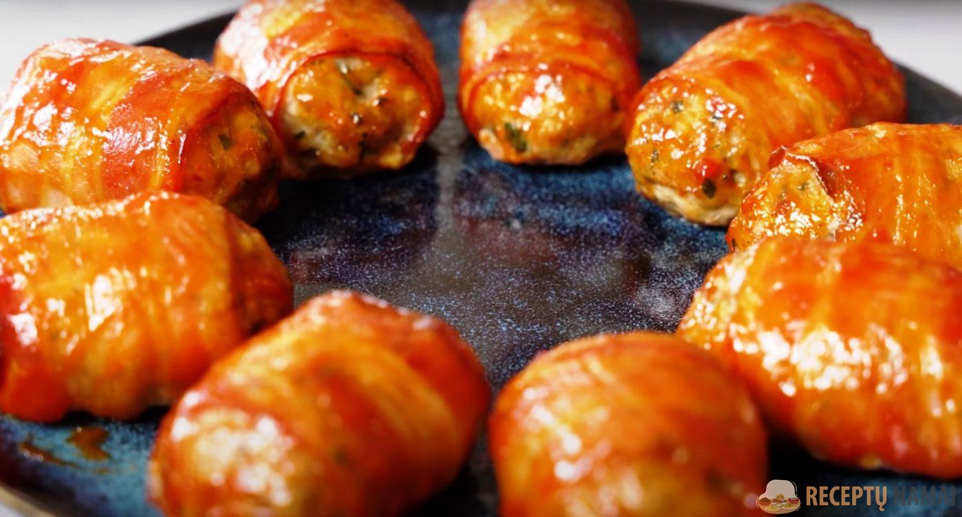 . Visus ingredientus išmaišykite. Suformuokite nedidelius kotletukus, uždėkite juos ant šoninės juostelių galų, į vidų suvyniokite maltą mėsą.
