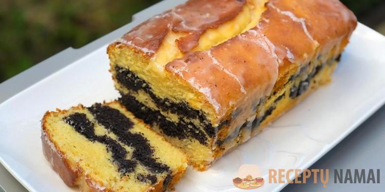 Formoje sluoksniuoju pakaitomis: tešla → aguonos → tešla → vėl aguonos → užbaigiu tešla. Taip pyragas gražiai išpjaunamas ir labai sultingas.