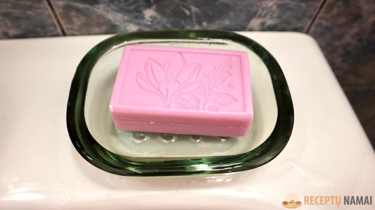 Labai svarbu, kad muilas nestovėtų vandens baloje ir neatrodytų kaip košė. Jau daugelį metų į muilinę dedu putplasčio indų plovimo kempinę: vanduo nuteka, bet muilas lieka sausas. Tada šia muiluota kempine nuvalau kriauklę ir čiaupą ir įdedu ją atgal.