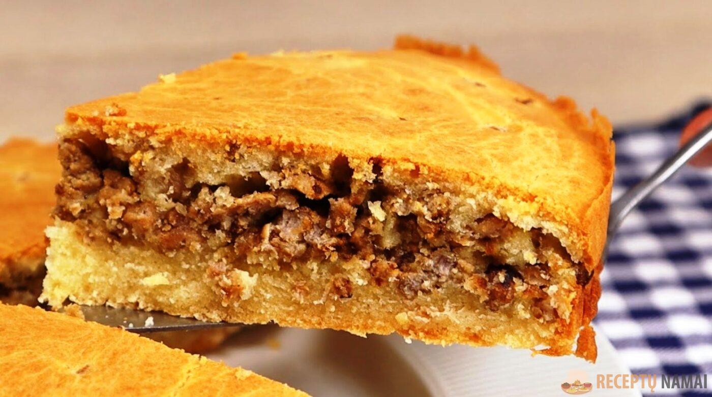 Mėsos pyragas yra labai vyriškas patiekalas, kurį bet kuris vyras suvalgys per porą minučių ir paprašys dar. Receptas yra labiausiai paplitęs, tačiau jis visada pavyksta, labai skanus ir sotus. Mėsos faršą galima pakeisti grybų ir bet kokiu kitu jums patinkančiu įdaru.