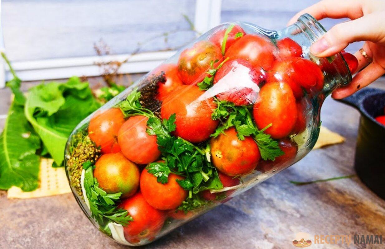 Į kibiro arba 3 l stiklainio dugną dedame krienų lapą, česnako skilteles, petražoles ir sluoksniais išdėliojame pomidorus, uždengiame žalumynais.
