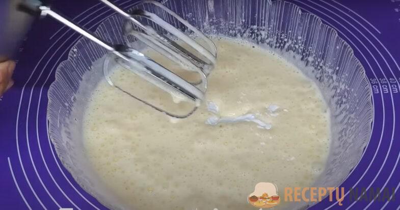 Kiaušinius su cukrumi plakiu mikseriu, kol mišinys tampa puresnis. Įpilu sodos ir išmaišau.