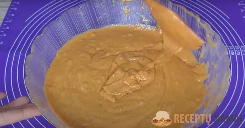 Karamelę plona srovele supilu į kiaušinių mišinį ir išmaišau. Įberiu miltus ir kepimo miltelius ir mentele maišau, kol tešla taps vientisa. Mišinį padalinu į 3 lygias dalis.