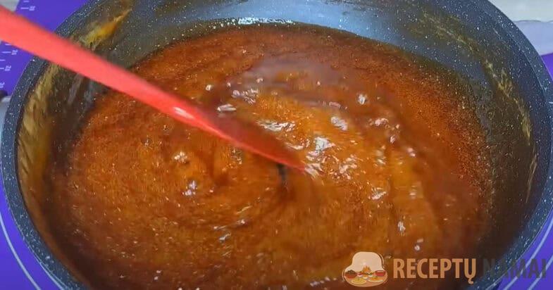 Į keptuvę pilu medų, įdedu minkšto sviesto, kaitinu, nuolat maišydama, kol viskas ištirpsta. Tada įberiu sodos, nuolat maišydama, masė sutirštėja ir tampa tamsiai rudos spalvos.