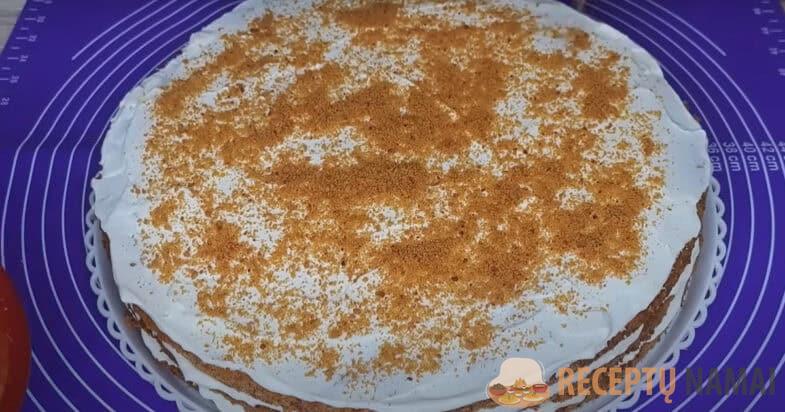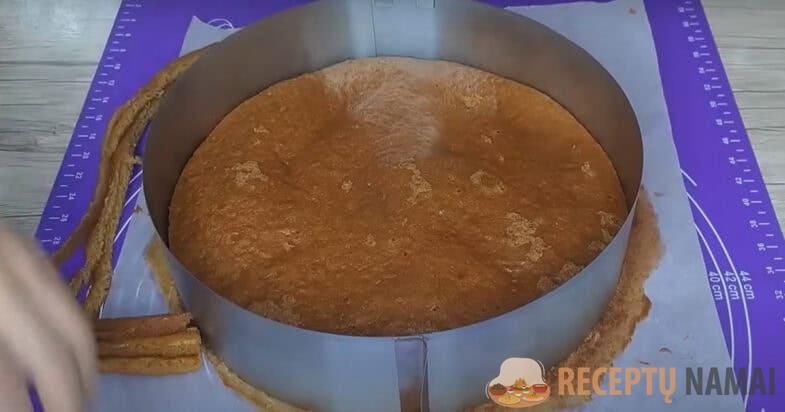 Į 40 cm skersmens formą įdedu kepimo popieriaus ir po vieną supilu 3 dalis tešlos. 3 pyragėlius kepu iki 180 laipsnių įkaitintoje orkaitėje apie 7-8 minutes. Tada pyragėlius atvėsinu, nuimu kepimo popierių ir forma išlyginu kraštus, apipjaustytą gabalėlį paversdama trupiniais, kuriais papuošiu pyragą.