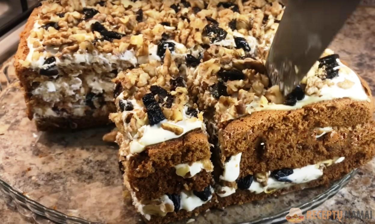 . Kiekvieną paplotį aptepkite kremu, apibarstykite riešutais ir džiovintomis slyvomis ir sukomplektuokite tortą.