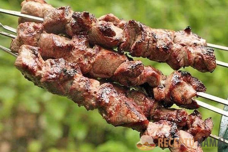 5. Mėsą suverkite ant iešmelių ir kepkite ant įkaitusio grilio, kol iškeps. Jei kebabą kepsite ant medinių iešmelių, prieš tai juos pamirkykite šaltame vandenyje. Tada kepant mediena mažiau degs ir lūš;