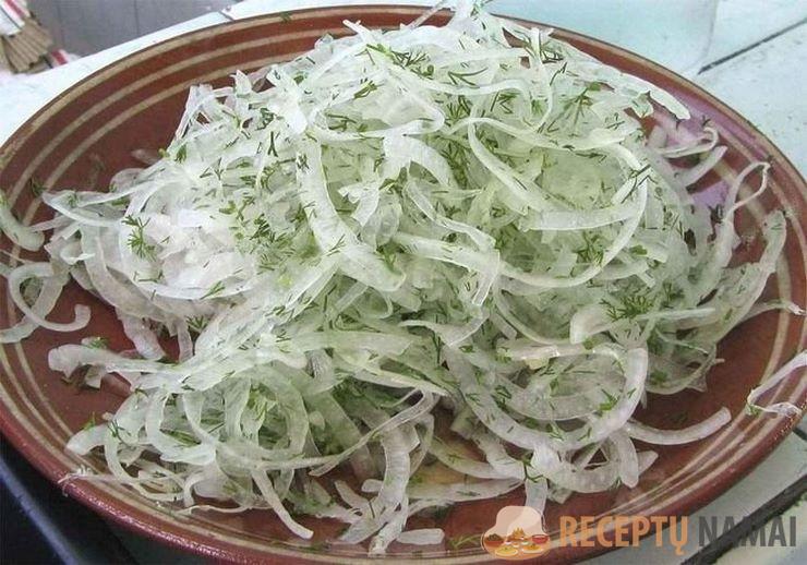 2. Svogūnas supjaustytas žiedais arba pusžiedžiais. Supjaustytą svogūną sudėkite į dubenį;