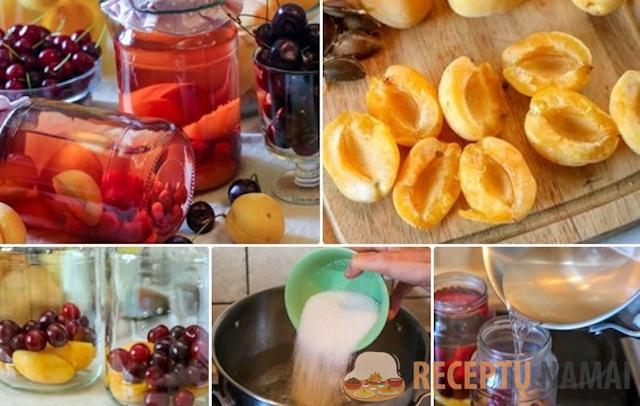 Pripildykite stiklainius vyšniomis ir abrikosų puselėmis