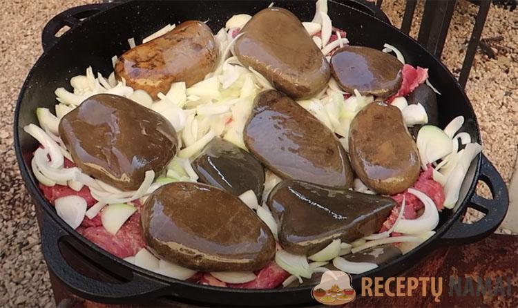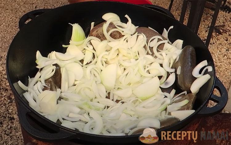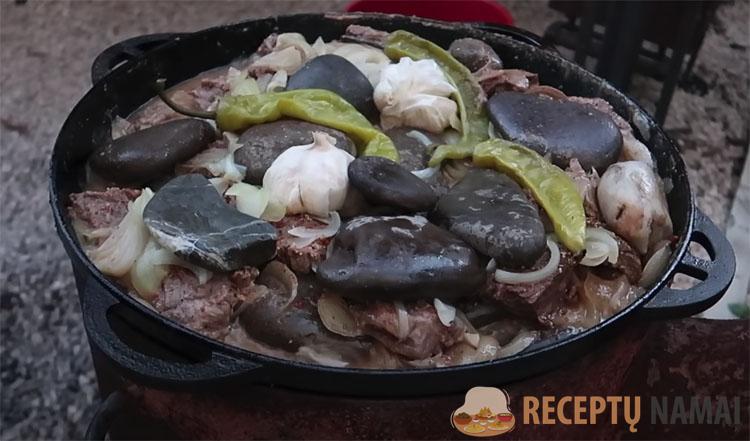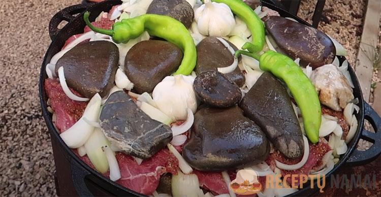 Pagrindas yra mėsa, svogūnai ir daržovės. Tačiau pirmiausia ant dugno dedame akmenų. Tada ateina eilė smulkintiems svogūnams.