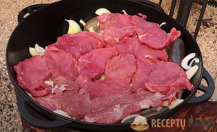 Ant svogūnų pagalvės dedame mėsą – gabalėlius išlaisviname nuo riebalų ir padarome palyginti plonus – ne daugiau kaip pusantro centimetro.