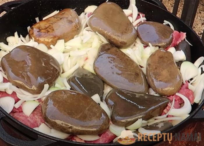Pagrindas yra mėsa, svogūnai ir daržovės. Tačiau pirmiausia ant dugno dedame akmenų. Tada ateina eilė smulkintiems svogūnams.