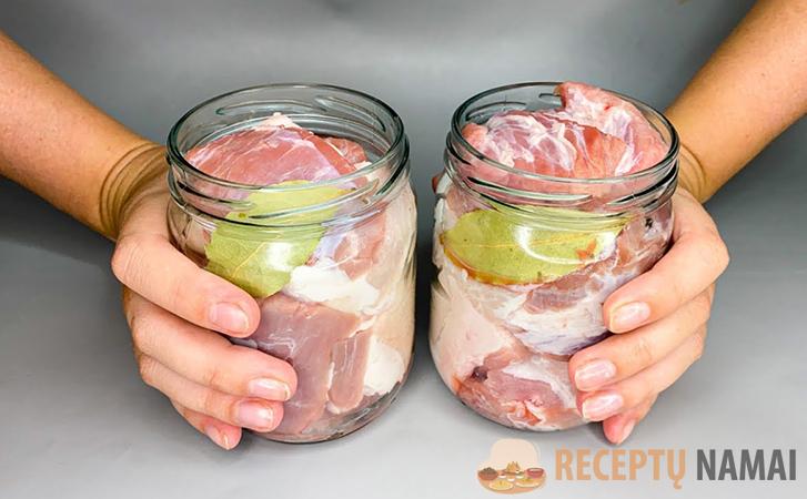 Mėsą supjaustykite mažais gabalėliais ir sudėkite į stiklainius. Į kiekvieną įdėkite po 1 česnako skiltelę, lauro lapą ir 2 žirnelius juodųjų pipirų.