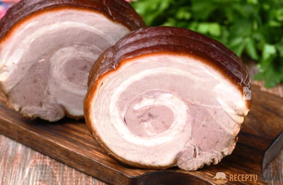 Supjaustome plonais griežinėliais, gražiai išdėliojame lėkštėje ir patiekiame kaip užkandį pietums, vakarienei, šventiniam stalui.