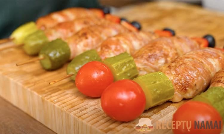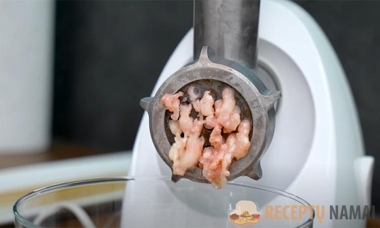 Ingredientai: 600 gramų vištienos šlaunelių be kaulų ir odos, 120 gramų svogūno, česnako skiltelė, šaukštas manų kruopų, 200 gramų šoninės, druskos ir juodųjų pipirų, patiekimui imti bet kokias daržoves – pagal patirtį marinuoti agurkai , alyvuogės, paprika čia puikiai atrodys paprikos ir pomidorai.