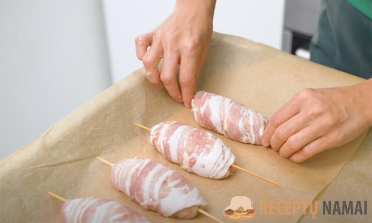 Dabar faršą padaliname į 8 dalis ir iš kiekvienos formuojame pailgus kotletus, kiek primenančius kebabą. Kotletus apvoliokite šonine ir suverkite ant iešmo. Iš išorės tai atrodo kaip tikras popsas.