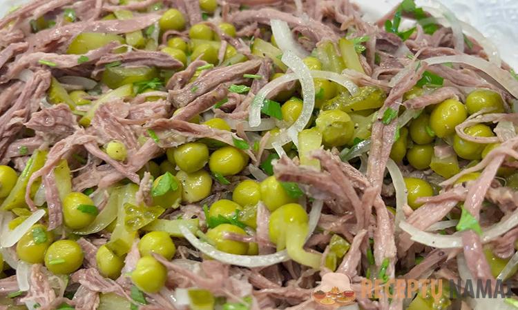 Virtos jautienos salotos – puiki greito užkandžio galimybė. Kad mėsa būtų švelnesnė, padalykite ją į skaidulas, pridėkite sultingų marinuotų agurkų, šviežių svogūnų ir konservuotų žirnelių ir jau beveik viskas paruošta Patiekalas pagardinamas alyvuogių aliejumi, kuris paryškina ingredientų skonį. Tokios salotos puikiai tinka ir paprastoms dienoms, ir šventėms.