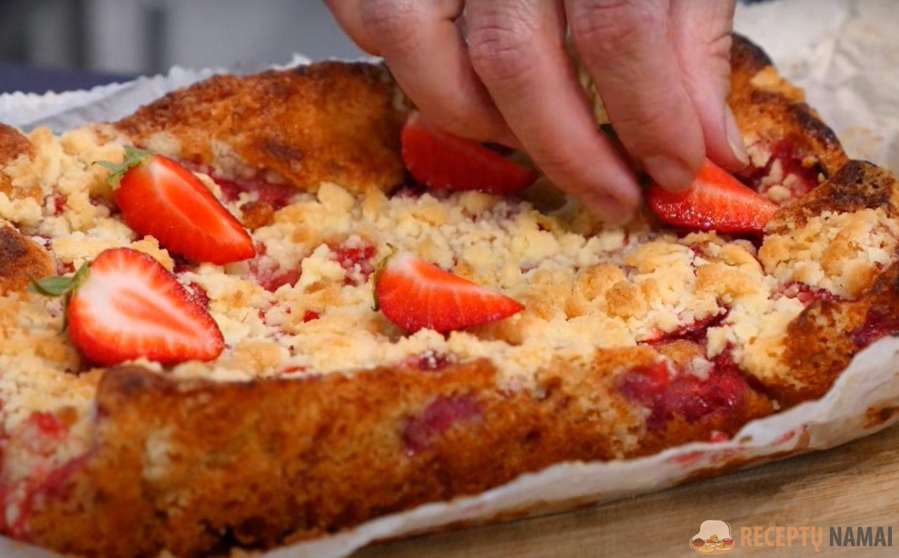 Gausite skanų paprastą pyragą su braškėmis. Tai puikus būdas pasigaminti skanų skanėstą arbatos vakarėliui.