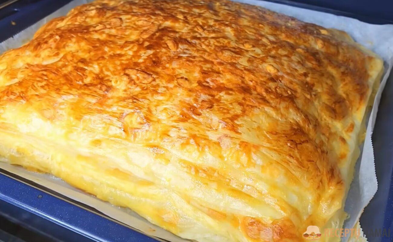 Gausite aromatingą sluoksniuotą pyragą su sūrio įdaru sluoksniuose.