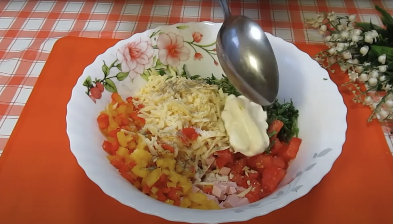Sūrį sutarkuokite stambia tarka. Viską sumaišykite dubenyje, suberkite smulkintas žoleles ir majonezą.
