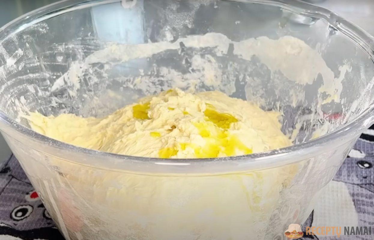 apie 15 minučių, palaipsniui supilkite likusį augalinį aliejų. Minkykite tešlą, kol ji taps lygi ir nelipni