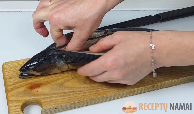 Peiliu braukite išilgai keteros link uodegos. Antrąjį pjūvį išilgai nugarkaulio padarykite lygiagrečiai pirmajam. Pirštais iš filė pašalinkite nugarkaulį ir vidurius.