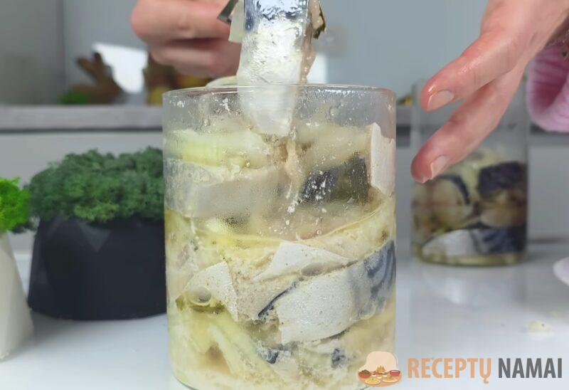 Į stiklainį sluoksniais sudėkite svogūnus ir skumbres. Supilkite likusį marinatą, uždenkite dangteliu ir palikite 1 dieną.