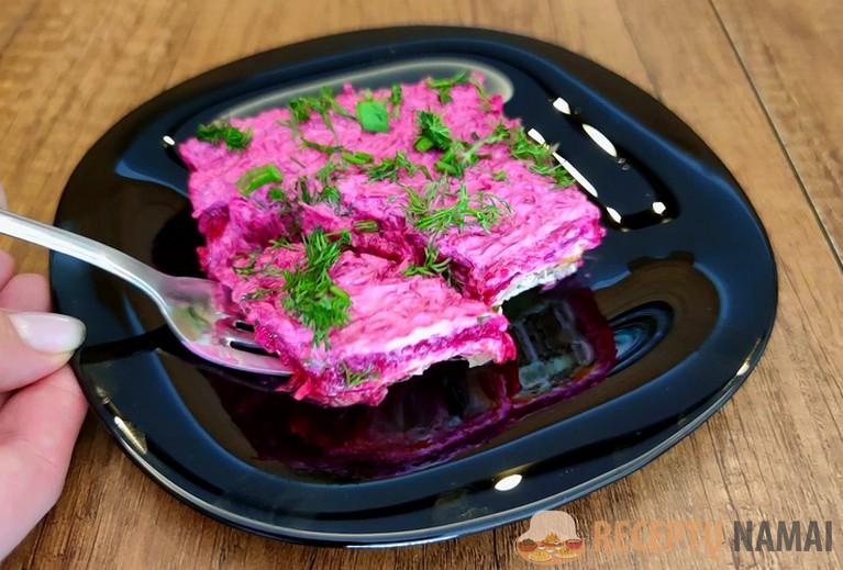 5 sluoksnis – tarkuoti burokėliai, druska, majonezo tinklelis .