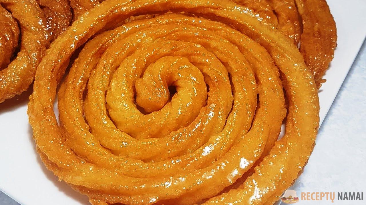 Įkaitinkite daug augalinio aliejaus ir po porciją išspauskite spiralės formos masę.