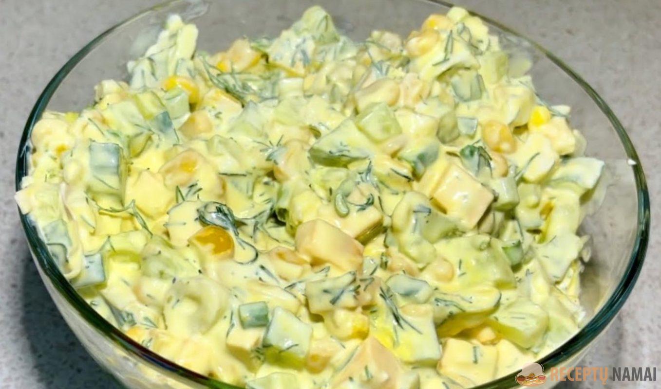 Išvirkite kietai virtus kiaušinius, atvėsinkite, nulupkite, supjaustykite mažais kubeliais ir suberkite į dubenį. Agurką ir sūrį taip pat supjaustykite mažais kubeliais ir sumaišykite su kiaušiniais