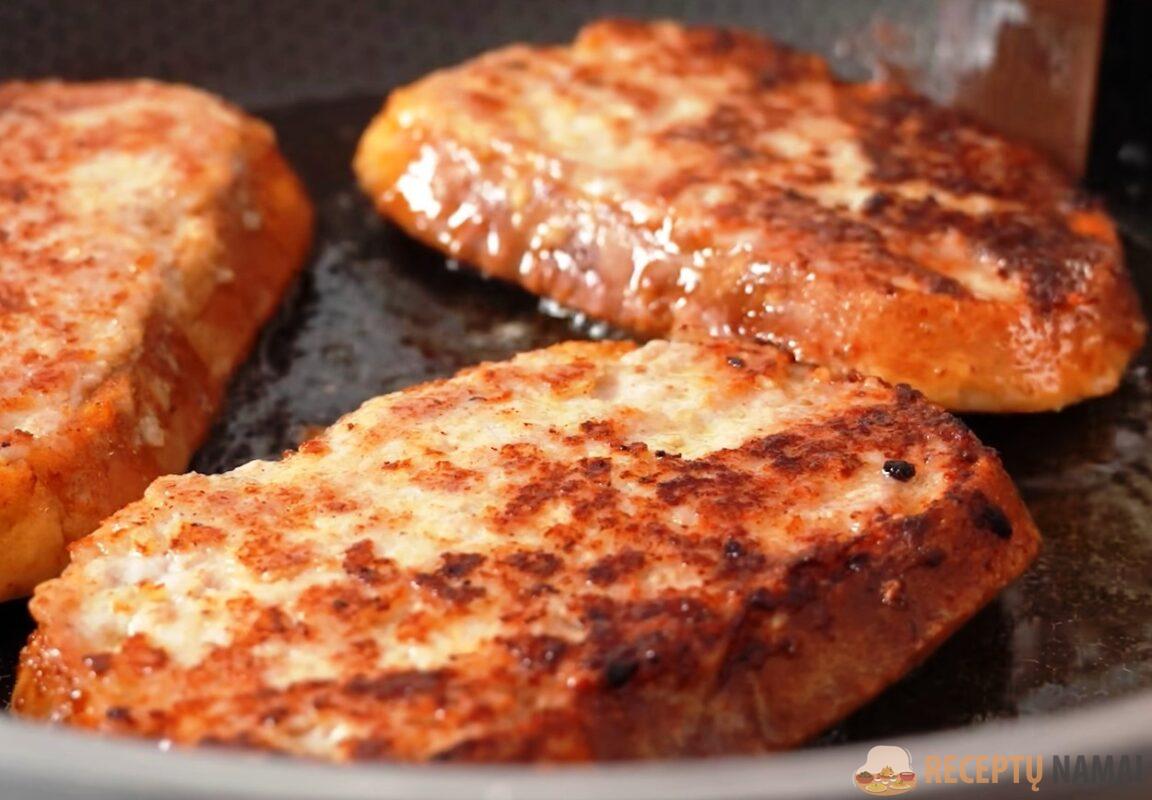 gautųsi auksiniai, kvapnūs karšti sumuštiniai su mėsa. Iškepę sumuštinius dėkite ant popierinio rankšluosčio, kad susigertų aliejaus perteklius.