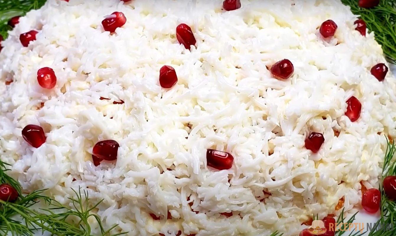 sluoksnio. Baltymus sutarkuokite stambia tarka ir morkų sluoksnį ištepkite majonezu. Salotų viršų pabarstykite baltymais. Papuoškite salotas krapais ir, jei norite, įberkite granatų grūdų.